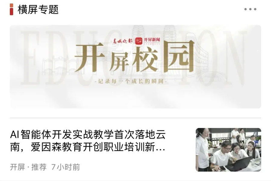 愛因森教育將“AI智能體開發應用”實戰教學率先引入云南,成為全省職教領域先行者,并受到媒體廣泛關注。